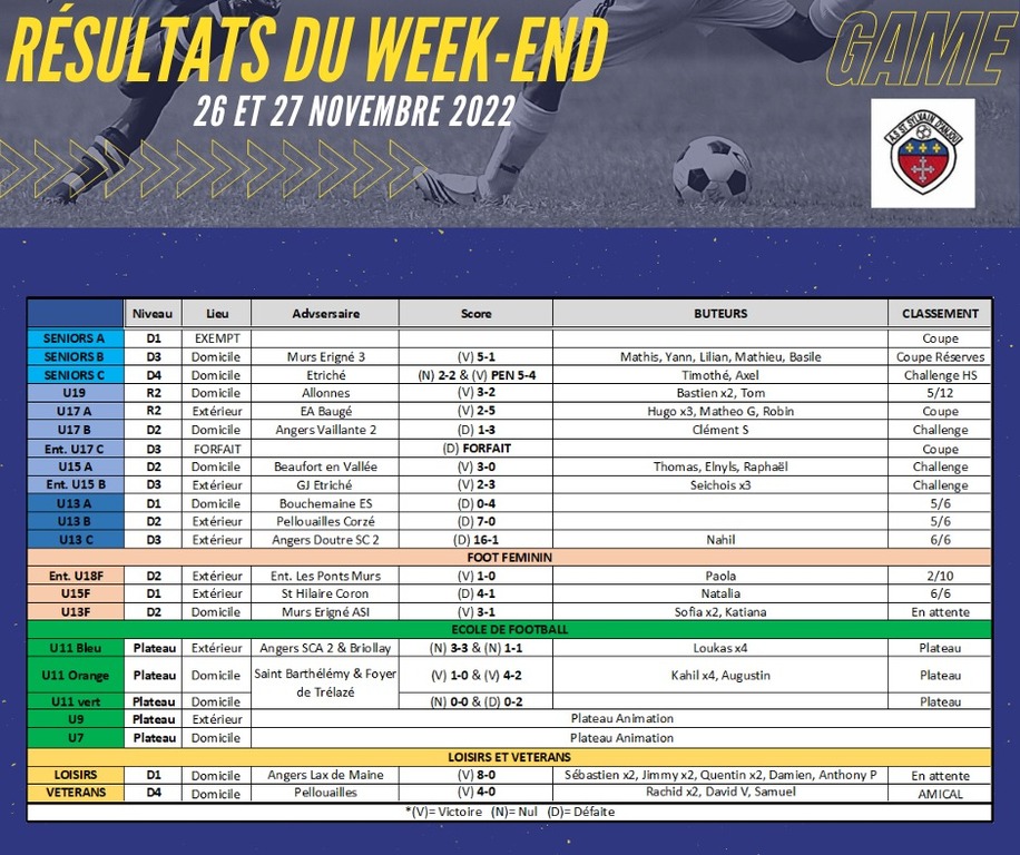 Résultats du week-end des 26 et 27 novembre